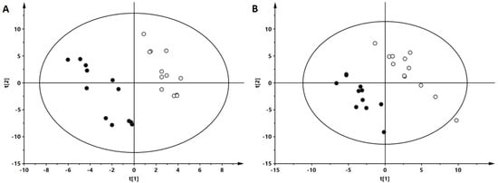 PLS-DA models based on plasma metabolite levels obtained before meal intake. Each panel shows results obtained for different data sets: panel A: ESI(-), R2 = 0.935, Q2 = 0.507; panel B: ESI(+), R2 = 0.987, Q2 = 0.647. R2: explained variance, Q2: predictive capability of the model. The OW/OB group is represented by solid circles, and the NW group by open circles.