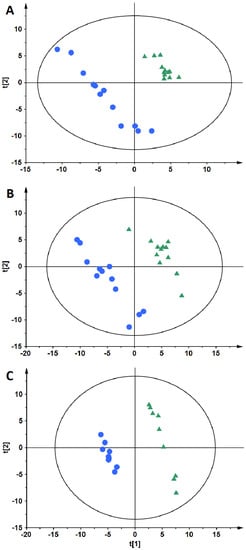 PLS-DA models based on postprandial AUCs for plasma metabolites obtained after HC meal intake (A,B) and NC meal intake (C). The OW/OB group is represented by blue circles and the NW group by green triangles. Each panel shows results obtained for different data sets: panel A: ESI(–), panels B and C: ESI(+).