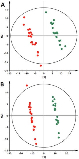 PLS-DA models based on postprandial AUCs for plasma metabolites obtained after HC meal taken with cinnamon/capsicum or placebo capsule. The data obtained from the samples collected during cinnamon/capsicum intervention are represented by red circles while during placebo intervention by green circles. Each panel shows results obtained for different data sets: panel A: ESI(-), R2 = 0.988, Q2 = 0.936; panel B: ESI(+), R2 = 0.997, Q2 = 0.973. R2: explained variance, Q2: predictive capability of the model.