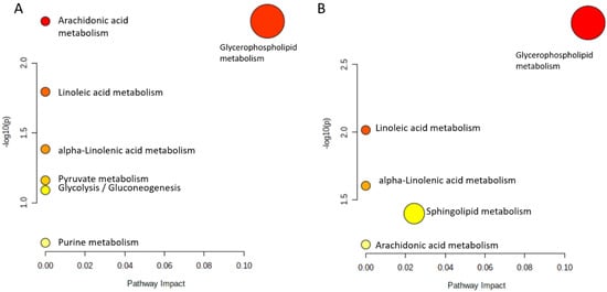 The results of pathway analysis performed for metabolites where AUCs were found significantly different between OW/OB and NW participants after a HC meal are presented in Figure 4 (panel A) and in Table S3 (panel A). Seven matching pathways were identified, among which four were statistically significant (arachidonic acid metabolism, glycerophospholipid metabolism, as well as linoleic and alpha-linoleic acid metabolism). In the cinnamon/capsicum study, five matching pathways were identified (Figure 5 and Table S3, panels B), all statistically significant. Interestingly, four of them were found significantly altered after HC meal intake by people from the OW/OB group. This shows that cinnamon/capsicum taken by people with OW/OB regulates the metabolic pathways altered by a HC meal. An additional metabolic pathway altered by cinnamon/capsicum was the sphingolipid metabolism.