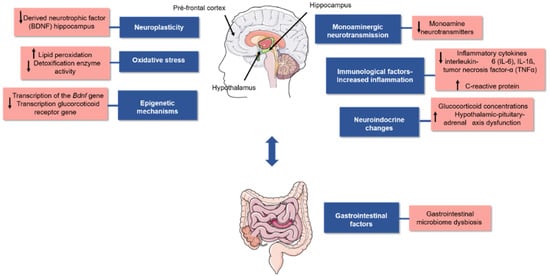 Although the reasons for this condition are not completely clear, several studies have proposed that it is associated with biological factors, such as changes in the levels of noradrenergic, serotoninergic, and dopaminergic neurotransmitters. These changes may be caused by the reuptake or degradation of monoamines in the synaptic cleft, reduction in neurogenesis, inflammation, oxidative stress, increased glucocorticoid concentration (e.g., cortisol), changes in gut microbial abundance and diversity, and epigenetic modifications in DNA. All these biological factors could correlate with the depression pathophysiology as represented in Figure 1 [,,,,,].
