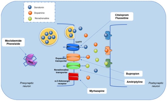 Although the mechanism of depressive disorder is not completely understood, pharmacological treatment primarily consists of drugs that modulate brain monoamine metabolism (Figure 2). Drugs, such as moclobemide and phenelzine, act through monoamine oxidase (MAO-A and MAO-B) inhibition. This pathway is associated with monoamines’ degradation. Tricyclic antidepressants, such as amitriptyline and nortriptyline, promote a non-selective inhibition of the reuptake of monoamines, mainly serotonin and noradrenaline. Selective serotonin reuptake inhibitors, such as fluoxetine and citalopram, noradrenaline and dopamine reuptake inhibitors (bupropion and reboxetine), and α2 adrenergic receptor antagonists, such as mirtazapine, are other options in the pharmacotherapy of depressive disorders [,,,,] (Figure 2).