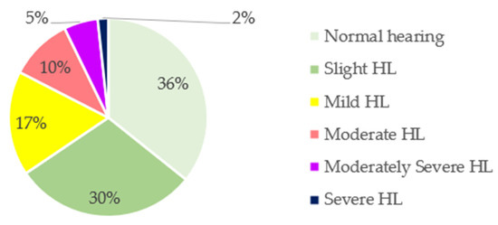 The prevalence of the degree of HL in the total sample is shown in Figure 1. To determine that degree, the ASHA classification was used as a reference: normal, <15 dB; slight, 16–25 dB; mild, 26–40 dB; moderate, 41–55 dB; moderately severe, 56–70 dB; severe, 71–90 dB; profound, >91 dB. Almost two-thirds (64%) of the sample exhibited some degree of HL. Only 36% exhibited normal hearing, whereas 30% showed slight HL, 17% showed mild HL, 10% showed moderate HL, 5% showed moderately severe HL, and 2% showed severe HL.