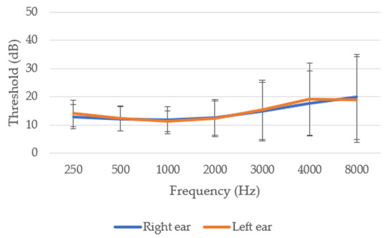 Hearing evaluation: The auditory function was assessed by tonal audiometry using Madsen Itera II Otometrics equipmentTM. Audiograms were collected in a soundproof booth to determine the hearing threshold using pure tones at frequencies of 250, 500, 1000, 2000, 3000, 4000, and 8000 Hz increasing by 5 dB [31]. The American Speech–Language–Hearing Association (ASHA) classification was used to determine the degree of HL: normal, <15 dB; slight, 16–25 dB; mild, 26–40 dB; moderate, 41–55 dB; moderately severe, 56–70 dB; severe, 71–90 dB; profound, >91 dB.