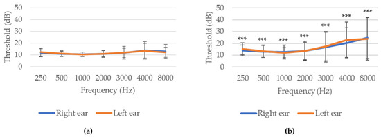 Audiometry of the sample sorted by age groups: (a) <40 years old; (b) ≥40 years old. *** p ≤ 0.001 indicate significant differences between age groups (Student’s t-test).
