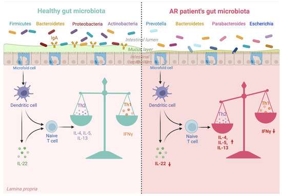 Gut microbiota dysbiosis in AR patients and its impact on Th1/Th2 balance. Gut microbiota composition differs between healthy individuals and AR patients. Gut microbiota typical for AR promotes unfavourable changes in cytokines, which promote the Th1/Th2 imbalance involved in AR development. Created with biorender.com, accessed on 24 September 2022.