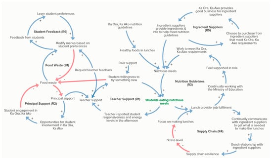 The final causal loop map comprised of six reinforcing loops and one balancing loop (Figure 1). These related to: teacher support, principal support, the Ka Ora, Ka Ako nutrition guidelines and government support, supply chain, ingredient suppliers, student feedback and food waste.