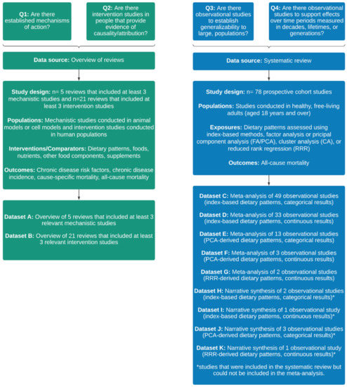 The objective of the overview of reviews was to summarise relevant evidence from systematic and narrative reviews on (1) mechanisms of action and (2) effects of interventions relevant to dietary patterns and all-cause mortality. Methods consistent with Cochrane were applied where relevant [31].