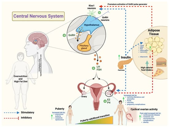 Recent studies have shown that obesity and premature puberty are closely connected. This correlation seems to be confirmed by the evidence collected to date on obese children and on different experimentally induced obesity animal models [18,19,20]. During puberty, mammals develop secondary sex characteristics, accelerate a linear growth, and gain reproductive functions. All these events are regulated mainly by the central nervous system through leptin signaling [21]. Indeed, evidence collected from the past decades suggest that high circulatory levels of leptin facilitate the onset of puberty by impacting the central kisspeptin/G protein-coupled receptor (GPR54) system [22,23]. Comparative investigations on physiological changes due to the exposure to a high-fat diet using female rats demonstrated that this kind of diet can bring puberty forward by accelerating the luteinizing hormone (LH) pulse frequency and by upregulating the central expression of kisspeptin. These findings suggest that obesity may have a long-term impact on reproductive functions by impairing the estrus cyclicity from the pre-pubertal stage to puberty [19,24].