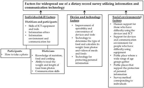 Categories and sub-categories of factors for widespread use of a dietary record survey utilizing information and communication technology (ICT) using focus group interview.
