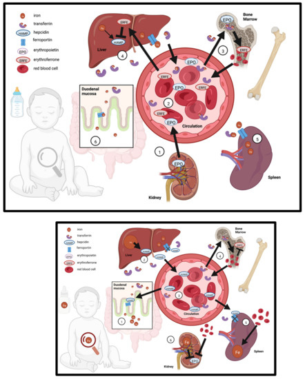 Homeostatic mechanisms control iron availability in early life, and postnatal growth necessitates rapid expansion of blood volume which increases demand for iron (Figure 1). Erythropoietin (EPO) is synthesized by the kidney in response to low oxygen or ID. Through endocrine signaling, EPO drives erythropoiesis and increases erythroferrone (ERFE) production in the bone marrow. ERFE signaling ensures that there is sufficient iron available for heme synthesis and RBC production by promoting iron absorption and increases circulating levels of iron, which is accomplished through suppression of hepcidin transcription in hepatocytes. Conversely, the iron regulatory hormone hepcidin is upregulated by bone morphogenic protein (BMP6) signaling in response to iron sensing by hepatic endothelial cells—in the absence of suppression by ERFE [55,56]. Hepcidin blocks ferroportin-mediated iron export in enterocytes, iron-storing hepatocytes, and spleen reticuloendothelial macrophages resulting in reduced iron circulation in the blood. This also leads to reduced iron absorption in the small intestine. The hepcidin-ferroportin axis serves as the systemic regulatory mechanism that prevents iron toxicity from dietary overexposure [57,58]. However, recent evidence suggests that this mechanism is not functionally mature in infants: Iron absorption is not well regulated in response to iron over-supplementation during the first year of life [9,10]. The same appears to be true for pre-weanling mice [59], rats [45,60] and piglets [39]. These animal studies show that intestinal ferroportin is hypo-responsive to hepcidin-induced degradation and permits elevated iron absorption during early development, despite substantial hepatic iron deposition [39,45,48,59,60]. This suggests infants are more vulnerable to iron overload.