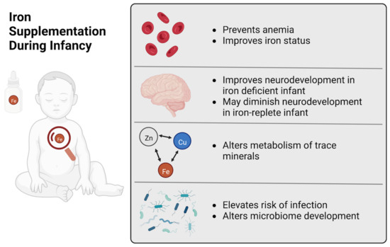 Existing reviews in this area are of high quality [13,14,15,17,20], but they do not provide a full overview of outcomes that have been observed in controlled human and animal studies. The purpose of this review will be to summarize outcomes of iron supplementation between birth and 12 months in infants, as well as the corresponding developmental stage in animal models. With the goal of identifying the most promising directions for future iron intervention research, we discuss likely biological mechanisms underlying risks and benefits of iron supplementation during infancy.