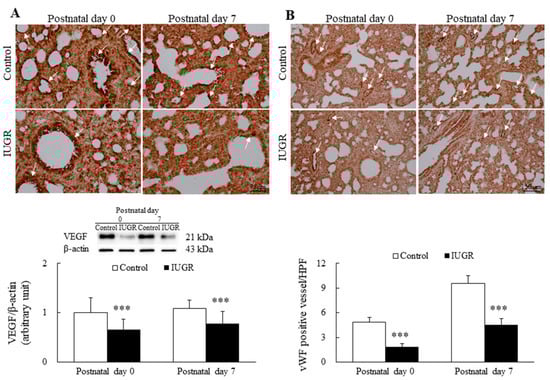 (A) Representative immunohistochemical images and Western blots of vascular endothelial factor (VEGF) and (B) representative immunohistochemical images for von Willebrand factor (vWF) and the results of semiquantitative vascular density analysis of control and IUGR rats on postnatal days 0 and 7. VEGF immunoreactivities (white arrow) were primarily detected in the endothelial and epithelial cells. Control rats exhibited similar VEGF and vWF immunoreactivities on postnatal days 0 and 7. By contrast, the VEGF expression, vWF immunoreactivity, and vascular density (white arrow) of the IUGR group were significantly lower than those of the control group on postnatal days 0 and 7. n = 7 rats at each postnatal day. Data are presented as means ± standard deviations. *** p < 0.001.