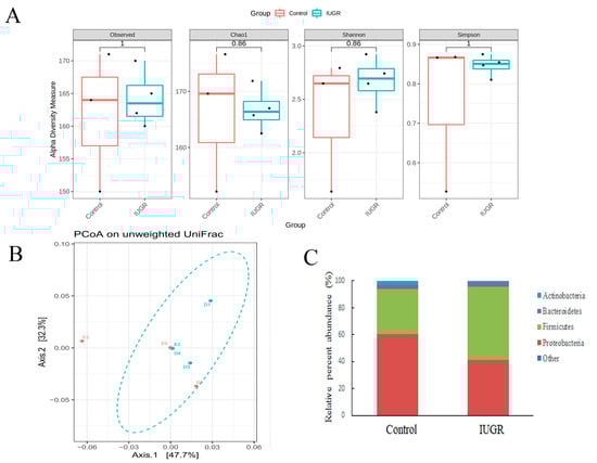 Impact of bilateral uterine artery ligation (IUGR group) or sham surgery (control group) on gestation day 18 on the maternal gut microbiota. Bilateral uterine artery ligation did not alter (A) α-diversity indices (observed, Chao1 index, Shannon, or Simpson), (B) β-diversity (PCoA on unweighted UniFrac distances), or (C) bacterial composition of the maternal gut microbiota at the phylum level. Other means the bacterial with lower abundances include Acidobacteriota, Campilobac-terota, Cyanobacteria, Desulfobacterota, Fusobacteriota, Verrucomicrobiota. Data are shown as box-and-whisker plots. Control group n = 3 and IUGR group n = 4 dams in each group.