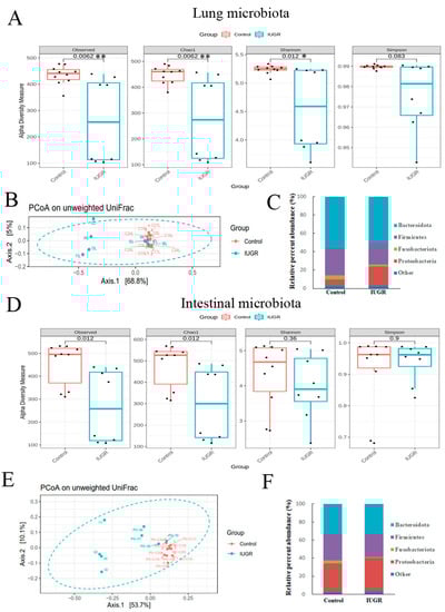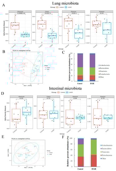 Regarding the lung microbiota, as shown in Figure 5A,B, the IUGR group exhibited significantly lower α-diversity and different β-diversity than the control group on postnatal day 7. By contrast, the α-diversity indices or β-diversity relating to the intestinal microbiota did not differ between the groups on postnatal day 7 (Figure 5D,E). On that day, the phylum-level bacterial composition of the intestine and lung microbiota was similar between the two groups (Figure 5C,F and Figures S4 and S5).