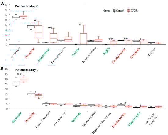 Relative abundances of the 10 most abundant genera in the lung microbiota of the control and IUGR groups on (A) postnatal day 0 and (B) postnatal day 7. On postnatal day 0, Acinetobacter, Nevskia, and Delftia were significantly enriched in the IUGR group, whereas Prevotella, Fusobacterium, and Finegoldia were significantly enriched in the control group. On postnatal day 7, Bacteroides, Sutterella, and Alloprevotella were significantly enriched in the IUGR group, whereas Prevotella and Fusobacterium were significantly enriched in the control group. Genera significantly enriched in the control and IUGR groups are labeled in red and green, respectively. n = 8–10 rats at each postnatal day. Data are shown as box-and-whisker plots. * p < 0.05, ** p < 0.01.