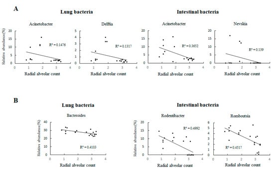 Correlations between lung and intestinal bacteria for which significant results were found at the genus level and the RAC on (A) postnatal day 0 and (B) postnatal day 7. On postnatal day 0, Acinetobacter and Delftia in the lungs and Acinetobacter and Nevskia in the gastrointestinal tract were significantly negatively correlated with the RAC (p < 0.01). On postnatal day 7, Bacteroides in the lungs and Rodentibacter and Romboutsia in the gastrointestinal tract were significantly negatively correlated with the RAC (p < 0.01). n = 8–10 rats at each postnatal day.