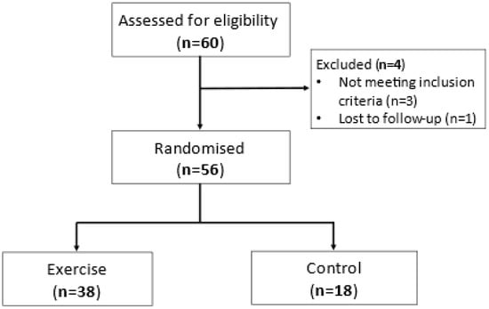 The experimental protocol has been described in detail previously [16]. This was a parallel, randomised controlled trial in which participants were randomised to: (1) 30–45 min of moderate–vigorous intensity exercise (55–85% of predicted heart rate maximum, HRmax (220-participants age)), or (2) 30 min of rest in a chair (control group). All exercise was performed on a cycle ergometer (Corival, Lode BV, Groningen, The Netherlands). The pre-intervention meal (breakfast) was consumed two hours pre-intervention, while the post-intervention meal (lunch) was consumed two hours post-intervention (Figure S1).