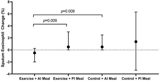 In the exercise group, participants who consumed an anti-inflammatory meal two hours post-intervention had a significant decrease in sputum %eosinophils (−0.5 (−2.0, 0.3)%) compared with participants who consumed a pro-inflammatory meal two hours post-intervention (0.5 (0.0, 3.0)%, p = 0.009) (Figure 2, Table 2). Conversely in the control group, the post-intervention meal E-DII had no effect on the change in sputum eosinophils (p = 0.827) (Figure 2, Table 2). The combination of an anti-inflammatory meal with exercise (−0.5 (−2.0, 0.3)%) reduced sputum eosinophils compared with an anti-inflammatory meal without exercise (0.5 (0.0, 2.5)%, p = 0.009) (Figure 2, Table 2). In the exercise group, there was also a trend towards a reduction in sputum eosinophil count in participants who consumed an anti-inflammatory meal (−26 (−89, −4) × 104/mL) compared to those who consumed a pro-inflammatory meal (5 (−1, 40) × 104/mL); however, this was not statistically significant after adjustment for multiple comparisons (p = 0.029) (Table 2). The E-DII score of the post-intervention meal had no influence on sputum neutrophils, macrophages or lymphocytes (Table 2).