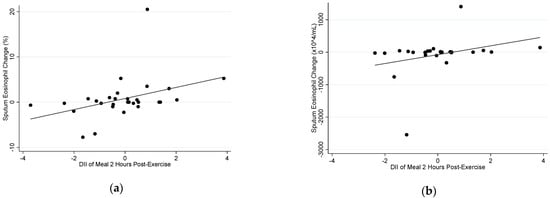 In the exercise group, there was a positive correlation between the E-DII of the meal consumed two hours post-exercise and the change in both sputum %eosinophils (rs = 0.478, p = 0.008) and sputum eosinophil count (rs = 0.425, p = 0.030) (Figure 3). However, there was no correlation between the E-DII of the meal consumed two hours before exercise and change in sputum %eosinophils (rs = −0.072, p = 0.722) or change in sputum eosinophil count (rs = 0.155, p = 0.480) in the exercise group.