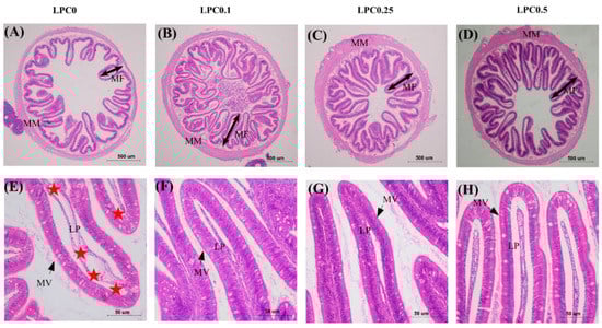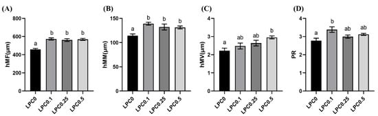 As shown in Figure 1E,F, the infiltration of mixed leucocytes, widened lamina propria, as well as disordered arrangement microvilli were observed in the distal intestine in the LPC0 group, but these symptoms were not observed in the LPC-supplemented groups. Compared with the LPC0 group, the height of mucosal folds (hMF) and muscularis mucosa (hMM) were visibly increased in the three LPC-supplemented groups, while the height of microvilli (hMV) and perimeter ratio (PR) were significantly increased only in the LPC0.1 and LPC0.5 group, respectively (p < 0.05) (Figure 2).