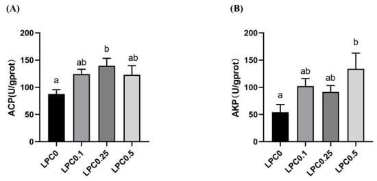 The activities of acid phosphatase (ACP) and alkaline phosphatase (AKP) were increased by dietary LPC, and the highest activities of ACP and AKP were observed in the LPC0.25 and LPC0.5 group, respectively (p < 0.05) (Figure 3).