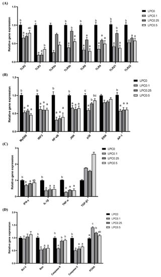 As shown in Figure 4B, LPC supplementation significantly reduced the gene expression of the adaptor protein (MyD88) and the downstream regulator molecules of the TLR signaling pathway, such as IRF3, NF-κB, JNK, and AP-1 (p < 0.05).