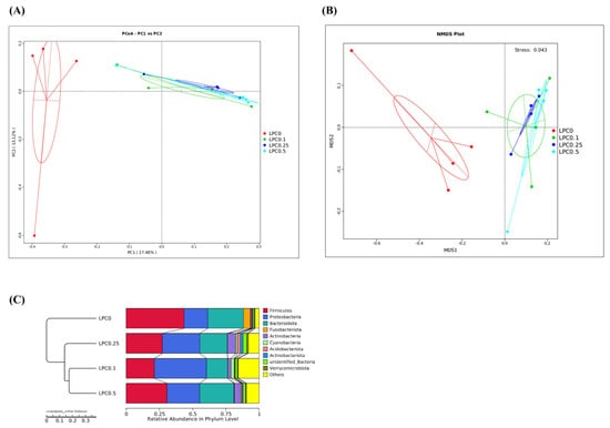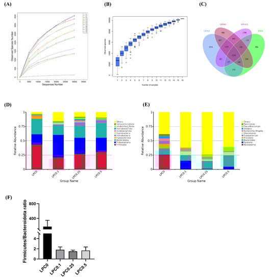 After assembly, quality control, and splicing, a total of 1,008,526 high-quality effective tags were obtained, clustering into 12,240 OTUs with over 97% sequence similarity among sixteen samples. Four samples per group were used for this analysis. The rarefaction curves and species accumulation boxplot showed adequate sequencing depth for allthe samples (Figure 5A,B). The Venn diagram showed that 1228 OTUs were shared by all groups, and the number of unique OTUs in group LPC0, LPC0.1, LPC0.25, and LPC0.5 was 584, 906, 1290, and 1534, respectively (Figure 5C).