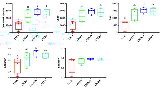 At the phylum level, Firmicutes and Proteobacteria were the predominant bacterial phyla, while the relative abundance of Bacteroidetes was next to them among all groups. At the genus level, the top 10 dominant genera included Mycoplasma, Ralstonia, Bacteroides, Prevotella, Fusobacterium, Alteromonas, Escherichia-Shigella, Alistipes, Faecalibacterium, and Parvimonas (Figure 5D,E). The ratios of Firmicutes to Bacteroidetes (F/B) in the LPC-supplemented groups were lower compared to the control group (p > 0.05) (Figure 5F). The results of the α-diversity analysis showed that the diets with 0.25% and 0.5% LPC significantly increased the bacteria richness (Observed species, Chao1, and Ace) (p < 0.05), while the diet with 0.1% LPC slightly increased these indices (p > 0.05). A significantly increased Shannon index was observed in the LPC0.25 group (p < 0.05) (Figure 6).