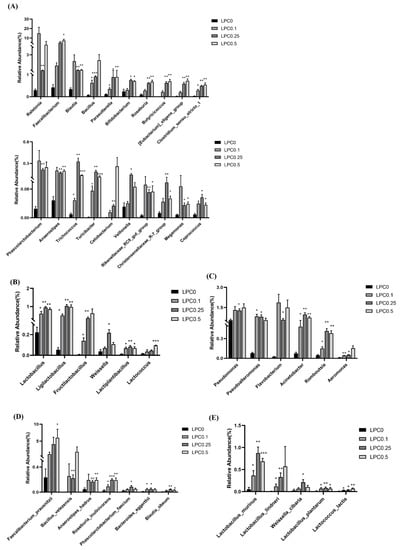 Metastat analysis of the intestinal microbiota communities among groups at different taxonomy. (A–C) Potential beneficial bacteria in intestinal microbiota at genus level. (A) Short-chain fatty acid producer, (B) Lactic acid producer, (C) Digestive enzyme-producing bacteria, (D,E) Potential beneficial bacteria in intestinal microbiota at species level. (D) Short-chain fatty acid producer (E) Lactic acid producer. * means significant difference between the LPC0 group and the LPC0.1, LPC0.25 or LPC0.5 group (* p < 0.05, ** p < 0.01, *** p < 0.001).