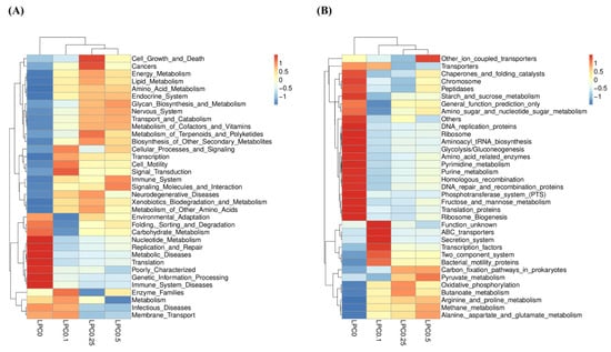The functional profile predicted at level 2 (A) and level 3 (B) KEGGs Orthologs.