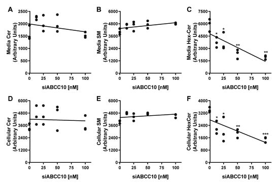 3.2. Dose–Response Effect of siABCC10 on HexCer Efflux and Synthesis