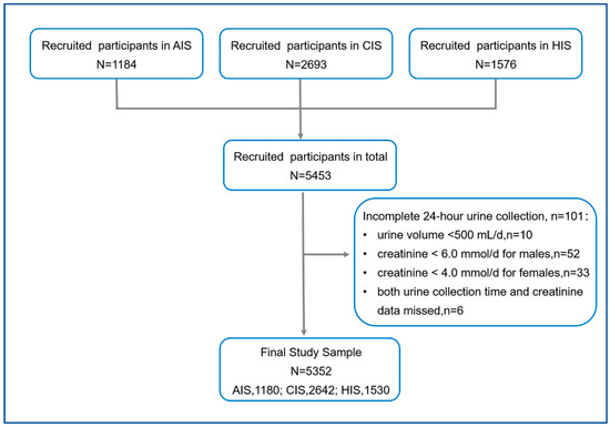 A total of 5453 adult participants were recruited in three RCTs. We excluded 101 incomplete urine samples, 10 for the 24-h urine volume < 500 mL, 52 for creatinine < 6.0 mmol for males, 33 for creatinine < 4.0 mmol for females, and six for both urine collection time and creatinine data missed. The remaining 5352 participants (98.1% of recruited participants; Figure 1) were included.