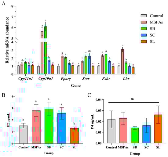 MSFAs can increase the expression levels of steroid steroidogenesis genes and luteinizing genes and promote estrogen synthesis. (A) The relative mRNA abundance in porcine ovarian granulosa cells treated with 1 mM SB, 0.4 mM SC, 0.01 mM SL or their combination for 24 h. (B) Concentrations of progesterone and (C) estradiol in the supernatant of porcine ovarian granulosa cells treated with different short-chain fatty acids, medium-chain fatty acids or their combination for 24 h. 1 mM SB; 0.4 mM SC; 0.01 mM SL. The results are presented as the means ± SEM. n = 9. Different letters between bars indicate p ≤ 0.05 by one-way ANOVA followed by post hoc Tukey’s tests. ns, nonsignificant (p > 0.05). SB, sodium butyrate; SC, sodium caprylate; SL, sodium laurate; MSFAs, SB + SC + SL.