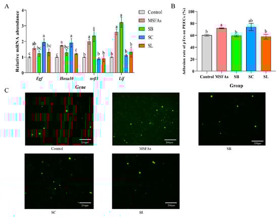 The combination of MSFAs can improve the receptivity of pig endometrial cells. (A) The relative mRNA abundance in porcine endometrial epithelial cells treated with 1 mM SB, 0.4 mM SC, 0.01 mM SL or their combination for 24 h. (B) Adhesion rate of porcine trophoblast cells to porcine endometrial epithelial cells treated with 1 mM SB, 0.4 mM SC, 0.01 mM SL or their combination for 24 h. (C) Image of adhesion of porcine trophoblast cells to porcine endometrial epithelial cells treated with 1 mM SB, 0.4 mM SC, 0.01 mM SL or their combination for 24 h observed under fluorescence microscope. The results are presented as the means ± SEM. n = 9. Different letters between bars indicate p ≤ 0.05 by one-way ANOVA followed by post hoc Tukey’s tests. ns, nonsignificant (p > 0.05). SB, sodium butyrate; SC, sodium caprylate; SL, sodium laurate; MSFAs, SB + SC + SL.