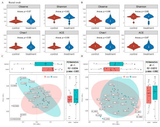 The microbiota diversity and compositions of rectal swab samples in sows at 14 and 28 days of gestation were determined by deep sequencing the 16S rRNA genes. To assess rectal swab microbial community structure, we calculated the alpha and beta diversity values (Figure 3). For richness indexes (observed species, Chao1), dietary supplementation with MSFAs had no effect (p > 0.05). On the other hand, beta diversity is shown in Figure 3. PCoA clustering revealed that the rectal swab microbiota of sows was not significantly dispersed in the control and treatment groups (p > 0.05). In conclusion, the addition of MSFAs to the diet did not effectively change the rectal swab microbiota diversity of sows at 14 or 28 days of gestation.