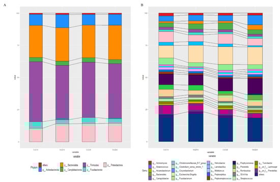 Effects of MSFAs during gestation on vaginal microbiota composition of sows. The relative abundances of different phyla (A) and genera (B) in the vaginal microbiota of control and treatment group sows at day 14 and day 28 at gestation.
