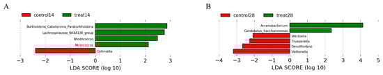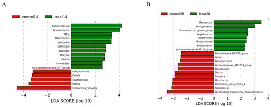 Effects of dietary supplementation with MSFAs on the rectal swab microbial diversity and compositions of sows at 14 and 28 days of gestation. Linear discriminant analysis coupled with effect size (Lefse) of day 14 (A) and day 28 (B) rectal swab microbiota compositions in the control and treated sows. Control14 (28), day 14 (28) of gestation and fed the basal diet. Treat14 (28), day 14 (28) of gestation and fed a basal diet supplemented with 0.1 SB, 0.05 SC and 0.1% SL.