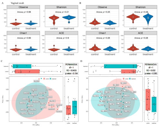 The microbiota diversity and compositions of vaginal samples in sows at 14 and 28 days of gestation were determined in the same way as in rectal swab samples. As showed in Figure 6, the alpha diversity values were no effect in dietary supplementation with MSFAs (p > 0.05). PCoA clustering revealed that the vaginal microbiota of sows was not significantly dispersed in the control and treatment groups (p > 0.05). Similarly, the addition of MSFAs to the diet also did not effectively change the vaginal microbiota diversity of sows at 14 or 28 days of gestation.