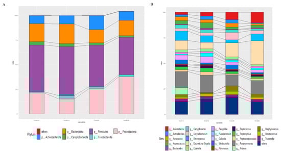 Operational taxonomic units (OTUs) with a 97% similarity cutoff [,] were clustered using UPARSE version 7.1 [], and chimeric sequences were identified and removed. The taxonomy of each OTU representative sequence was analyzed in RDP Classifier version 2.2 [] against the 16S rRNA database (Silva v138) using a confidence threshold of 0.7. We performed α- and β-diversity calculations and taxonomic community assessments using Qiime2-2020.11 scripts. The alpha diversity of the samples was calculated with the observed species, Chao 1 and Shannon indexes. Principal coordinate analysis (PCoA) based on the weighted UniFrac distance was used to summarize the beta diversity. Linear discriminant analysis coupled with effect size (LEfSe) was used to identify the key bacterial taxa between different treatments [].