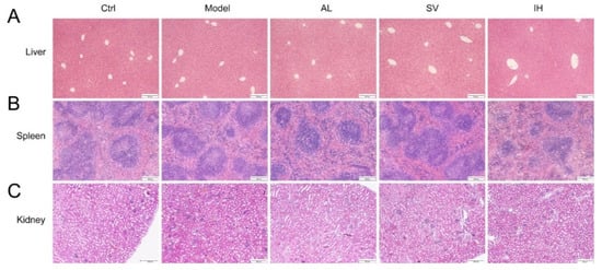 YEP and OXO administration caused a 29.35% increase in the serum UA levels in mice (p < 0.05, Figure 1B), which was reduced by AL up to 61.34% (p < 0.001), by SV up to 22.69% (p < 0.05), and by IH up to 72.45% (p < 0.001) (Figure 1B). AL, SV, and IH failed to influence the body weights and organ indices of mice with hyperuricemia (Table 1). Among all of the experimental mice, no significant changes were observed in the pathological sections including the liver, spleen, and kidney (Figure 2).