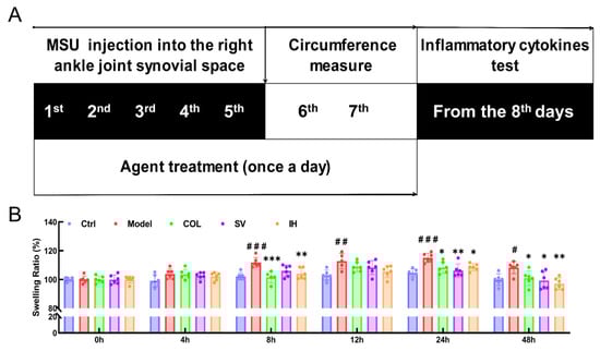 SV and IH relieve the swelling ration of ankle joints in MSU-induced acute gouty arthritis in rats. (A) Schematic diagram of the experimental schedule performed in rats with gouty arthritis. (B) SV and IH suppressed the swelling ratio of ankle joints in rats with acute gouty arthritis. Data are shown as means ± SD (n = 6 rats/group). # p < 0.05, ## p < 0.01, ### p < 0.001 vs. Ctrl group, * p < 0.05, ** p < 0.01, *** p < 0.001 vs. model group.