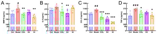 SV and IH inhibited the inflammatory response in acute gouty arthritis rats. The effects of SV and IH on the serum levels of MMP-9 (A), IL-8 (B), CCL-2 (C), and TNF-α (D) in acute gouty arthritis rats. Data are shown as means ± SD (n = 6 rats/group). # p < 0.05, ## p < 0.01, ### p < 0.001 vs. Ctrl group, * p < 0.05, ** p < 0.01, *** p < 0.001 vs. model group.