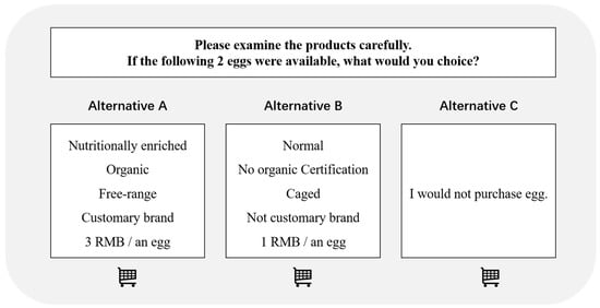 The role of price as an attribute is to generate a part-worth utility for calculating the WTP participants assigned to the presence of the other attributes. We also believe that when consumers face a relatively new product, the price can be a quality signal to help them make the purchase decision. The present survey set the price attribute ranging from CNY 1 per egg to CNY 4 per egg. The lowest and highest prices are obtained through field research before the present survey.