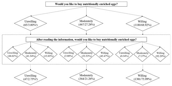 Respondents’ purchase intention before and after receiving the information. Note: a, b the proportion was calculated according to the total number of people in the treatment groups (n = 1712). For example, 3.80% of participants, who were in treatment groups, were unwilling to try to purchase the nutritionally enriched eggs.