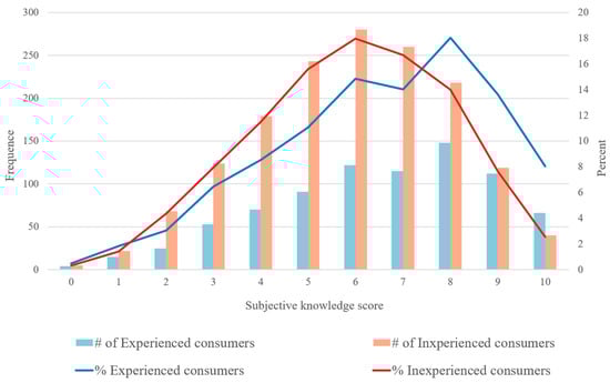 The mean objective knowledge score of experienced and inexperienced consumers are 6.51 and 5.89, respectively. The objective knowledge score of consumers with experience purchasing eggs with nutritional fortification is significantly higher than that of consumers without experience. Figure 4 shows the number and percent of experienced and inexperienced consumers among the different scores. The objective knowledge scores of consumers without purchase experience exhibit an approximate normal distribution. The scores of consumers with purchasing experience are relatively concentrated in segments with higher scores. More than 18% of experienced consumers scored eight points on the test, while nearly 18% of inexperienced consumers scored six points on the test.