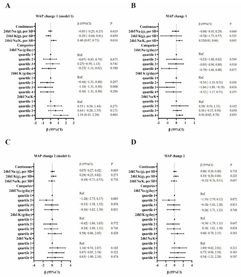 We conducted univariate and multivariate linear regression analyses to evaluate the associations of 24hUNa, 24hUK, and 24hUNa/K with the SSBP (MAP change 1 or MAP change 2). The results are shown in Figure 1. The 24hUNa/K as a continuous variable was positively associated with MAP change 1 before (β = 0.40, 95% CI: 0.07, 0.73) and after (β = 0.33, 95% CI: 0.01, 0.66) being adjusted for age, gender, BMI, FBG, and baseline MAP. No significant associations were observed between 24hUNa and 24hUK as continuous variables with MAP change 2 (p > 0.05). In the univariate linear regression model, compared with cases in the lowest quartile of 24hUK, those in the third quartile were associated with a lower MAP change 1 (β = −1.16, 95% CI: −1.31, 0.40). Compared with cases in the lowest quartile of 24hUNa/K, those in the fourth quartile were associated with a higher MAP change 1 (β = 1.34, 95% CI: 0.43, 2.26). After adjustment for age, gender, BMI, FBG, and baseline MAP, compared with cases in the lowest quartile of 24hUK, those in the third quartile were associated with a lower MAP change 1 (β = −1.04, 95% CI: −1.89, −0.19). Compared with cases in the lowest quartile of 24hUNa/K, those in the fourth quartile were associated with a higher MAP change 1 (β = 0.36, 95% CI: 0.03, 0.70).