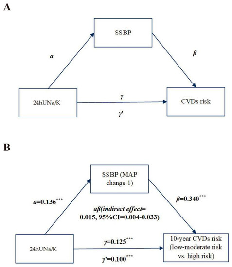 To examine whether the SSBP as a mediator was involved in the association between the Na/K ratio and CVD risk, we utilized the common protocol (Figure 1A) [24]. Considering the relationship between SSBP or the Na/K ratio and CVD risk has been examined, we analyzed whether SSBP was a possible mediator of this path. Continuous SSBP, the Na/K ratio, and CVD risk were utilized for the mediation model adjusted for baseline MAP. The PROCESS macro v2.16.3 for SPSS was utilized to test the mediation path. Bootstrapping was used to test mediation signification [25]. Model 4 (used for simple mediation models) from the PROCESS macro was utilized with 5000 bootstraps to compute the direct and indirect effect between the Na/K ratio, SSBP, and CVD risk. p ≤ 0.05 was considered significant. The statistical test was operated in IBM SPSS Statistics 24.0 software (SPSS, Chicago, IL, USA).