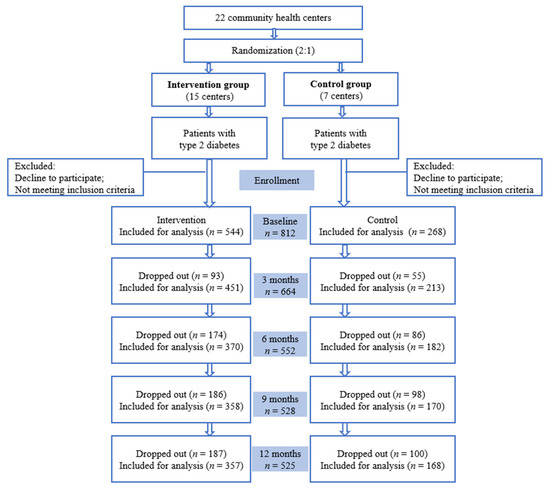 This one-year community-based cluster-randomized control trial was developed to assess the dietary skills of type 2 diabetic patients and the effect of using dietary management tools on them. The protocol was approved by the Biomedical Ethics Committee of Peking University (IRB00001052-17044). Twenty-two community health centers in Shunyi and Tongzhou districts were randomly assigned to an intervention group and a control group in a 2:1 ratio by a computer-generated list of random numbers. Participants in the intervention group received a food guiding booklet and a dinner set, while patients in the control group received usual care. Data were collected at baseline and 3, 6, 9, 12 months follow-ups.