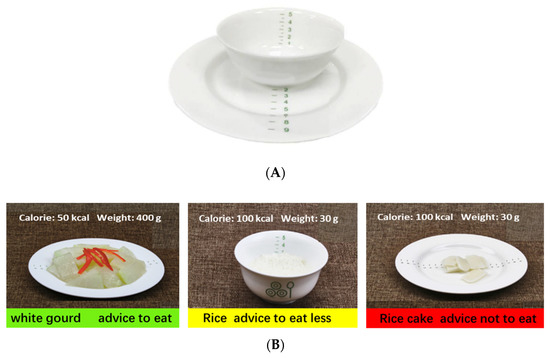 As well as receiving basic public health services, subjects in the intervention group were distributed dietary management tools and educated on how to use them. The dietary management tools included a food guiding booklet and a dinner set (Figure 2). The dinner set was customized for the project, with each set including a graduated rice bowl and a dinner plate. Color-printed food guiding booklet was produced to provide dietary guidance based on the theories of food exchange portion, glycemic index (GI), and glycemic load (GL), the contents of which included the cooked weight and calories per unit mass (50 g/100 g) of various types of food. This booklet used the traffic light method, which has been used in several dietary education programs [44,45,46,47], to distinguish between three GI categories: (1) Green = Low GI and GL = advice to eat, (2) Yellow = Medium GI and GL = advice to eat less, and (3) Red = High GI and GL = advice not to eat. In particular, the dinner set and food in the guiding booklet were the same sizes as their actual liking. Therefore, participants could prepare meals directly according to the amount of food in the book. Patients in intervention groups were educated on dietary management knowledge such as how to calculate total daily energy requirements and how to prepare a meal according to the food guiding book.